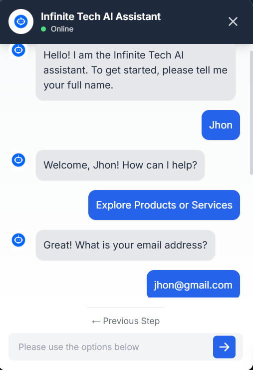 The chatbot introduces your brand, understands the user’s intent, and instantly guides them toward the right service or product.What happens here: