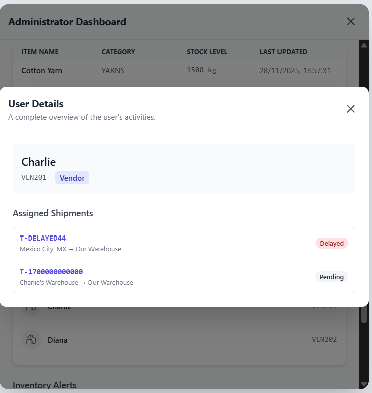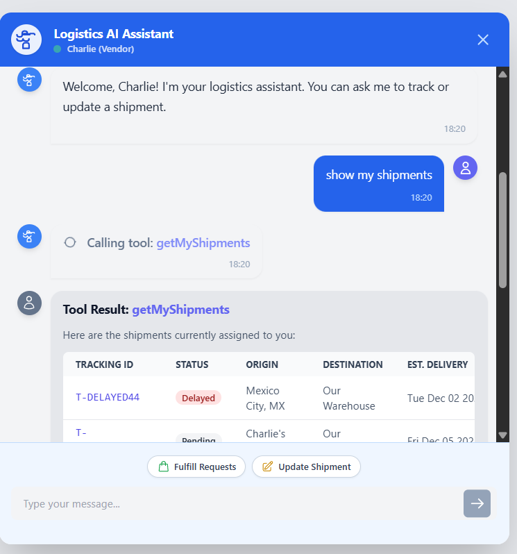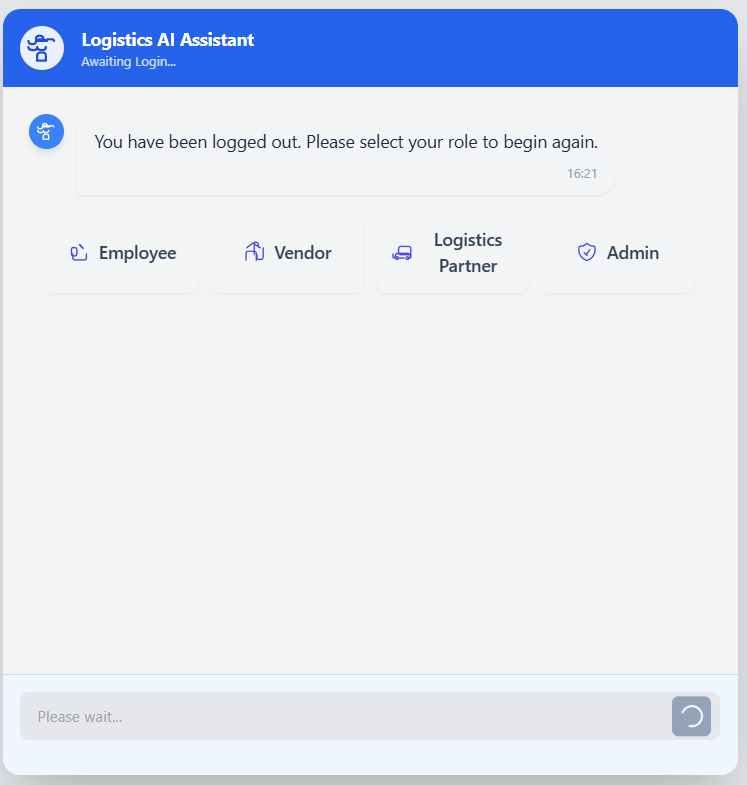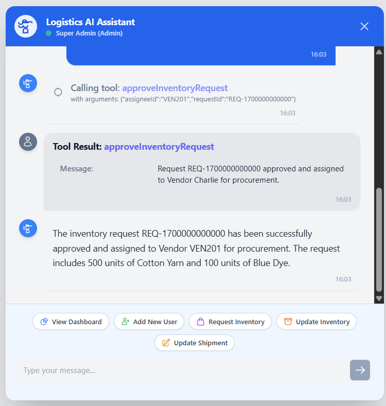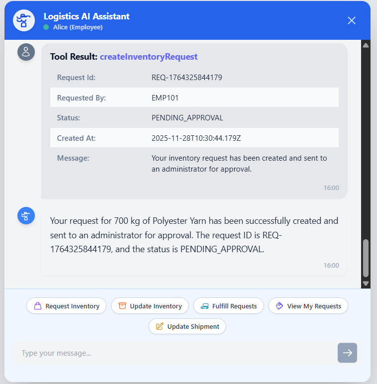 Your workflow begins the moment you open the logistics assistant. Simply type what you need — from inventory requests to shipment updates — or choose from ready-made action pills like Request Inventory, Update Shipment, or Check Status. The assistant instantly understands your intent using natural language recognition and verifies your role (Employee, Admin, Vendor), ensuring every request is placed in the correct operational queue. This eliminates ambiguity, reduces miscommunication between teams, and ensures that each request flows into the right approval path from the very start.