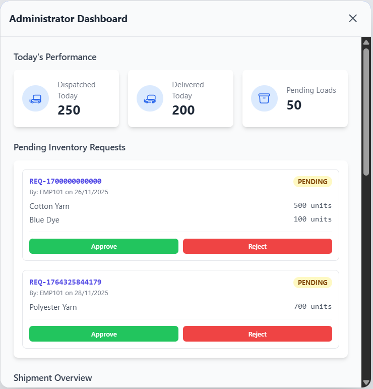 Every request requiring admin oversight is displayed in a centralized dashboard that highlights Pending, Approved, and Rejected states. Administrators can open any request and take action with a single click using large, high-visibility Approve or Reject buttons designed for speed and clarity.