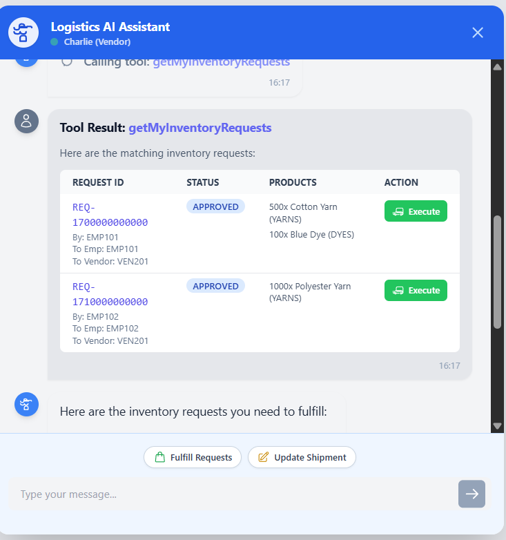 Vendors see all approved requests under Inventory Requests and trigger fulfillment using the Execute button. The assistant generates a shipment record with a unique tracking ID (e.g., T-1700000000…), item breakdowns, carrier details, origin, destination, and ETA.