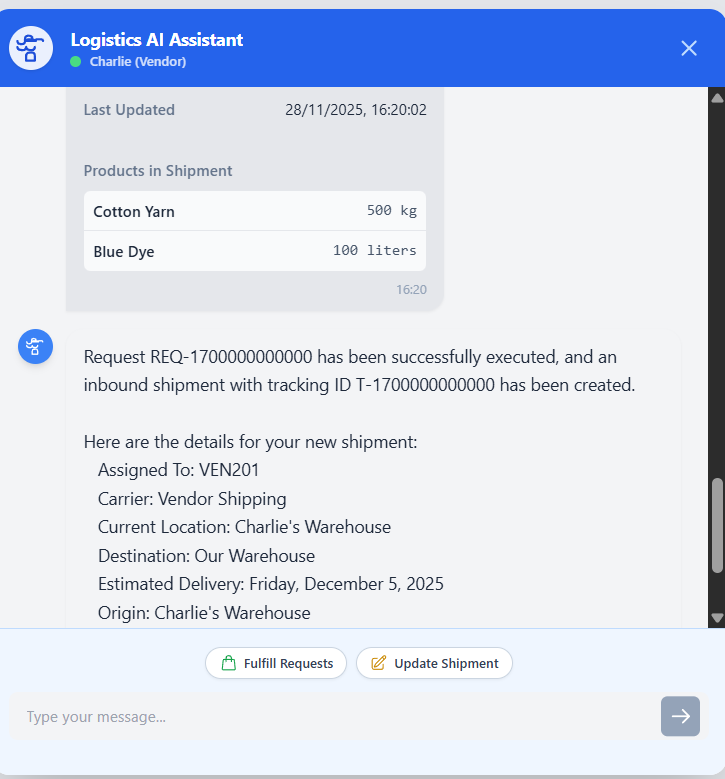 For vendors, the assistant becomes a streamlined execution hub. Vendors can see all approved requests and fulfill them instantly using the Execute button. Once executed, the system automatically creates a structured shipment entry with: